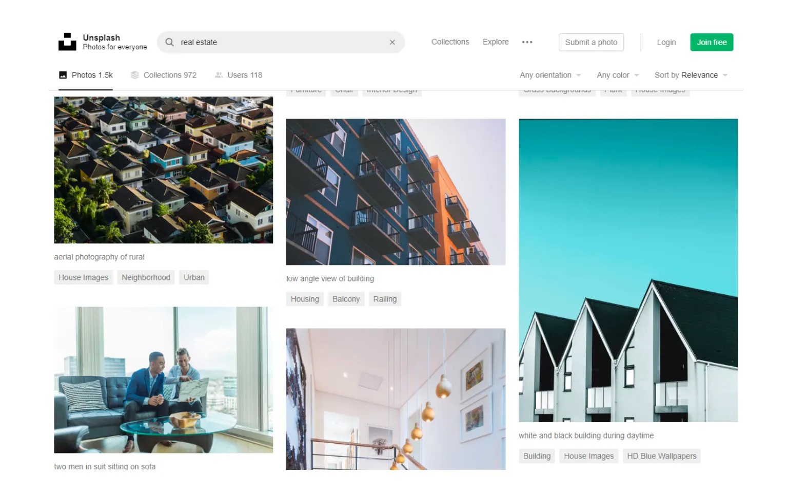 Unsplash에서 real estate(부동산)을 검색하면 이런 이미지들이 나옵니다.
